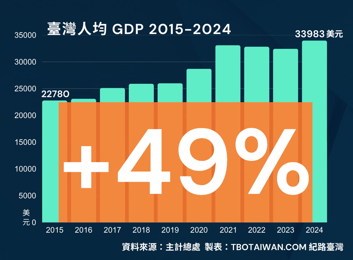 【紀路臺灣】2025 年 2 月 26 日,主計總處公布臺灣 2024 年經濟成長率 4.59%,名目 GDP 達 7955.73 億美元創新高,人均 GDP 達 3 萬 3983 美元刷新紀錄,較前年增加 1541 美元、4.7%;過去 10 年,臺灣人均 GDP 從 2015 年的 2 萬 2780 美元上升到 3 萬 3983 美元,增幅 49.17%。