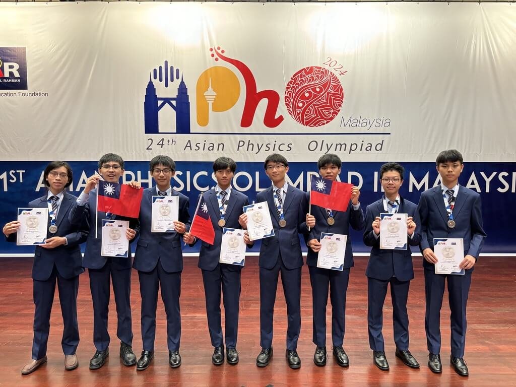 2024 年 6 月 9 日,第 24 屆亞洲物理奧林匹亞競賽傳來捷報,我國 8 位高中生蔡忠達、吳席綸、彭明遠、曹祖恩、郭宸璿、王冠宇、連柏宇、許祐愷,從 27 個國家、208 名參賽選手當中脫穎而出,共拿下 3 金 5 銀排名大會第 5。我駐馬來西亞代表處卜正珉公使代頒贈代表團成員教育部鄭英耀部長賀電,恭賀代表團榮獲佳績,為國爭光。