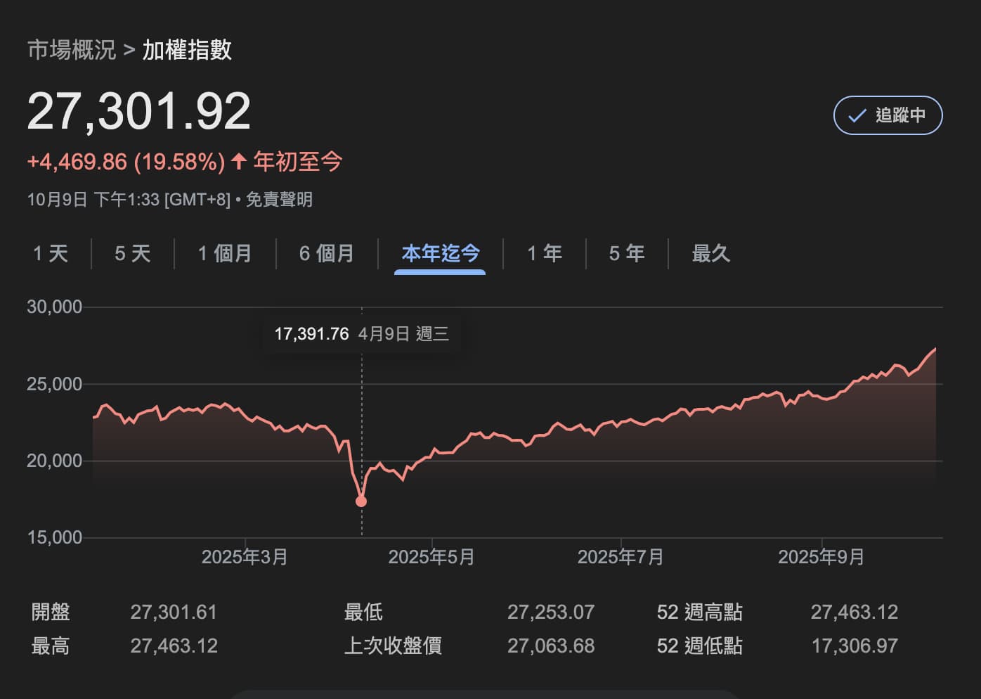 臺股自美國總統川普今年 4 月「解放日」以來,一度在 4 月 9 日跌至 17391.76 點,6 個多月來已上漲 9910.16 點、漲幅 56.98%。