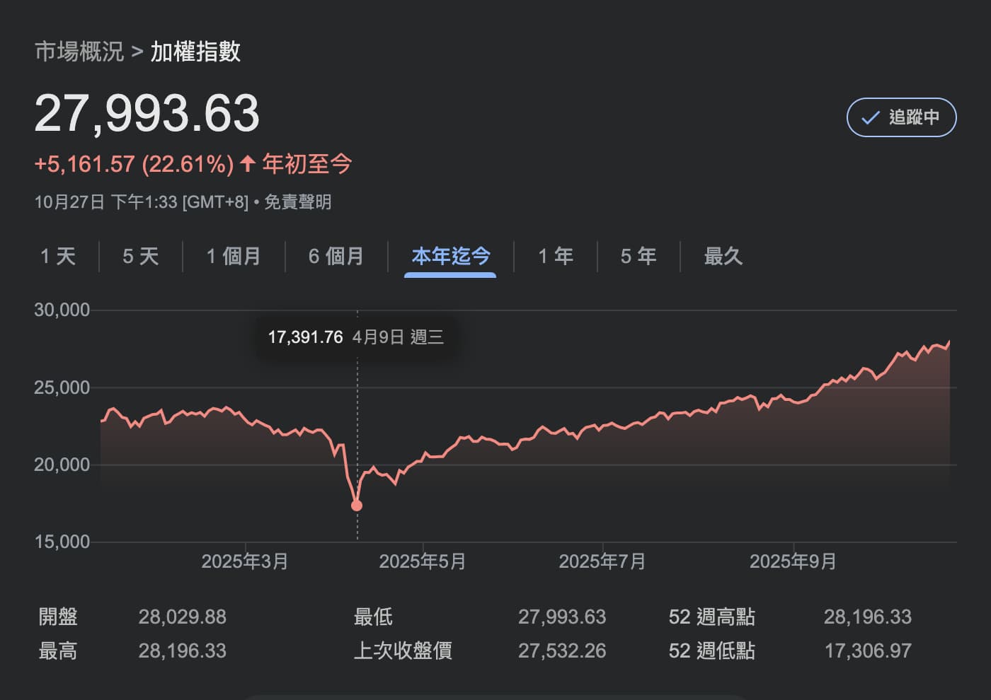 【紀路臺灣】2025 年 10 月 27 日,臺股今天盤中一度大漲 664 點,衝破 28000 點大關,最高觸及 28196.33 點,終場上漲 461.37 點,收在 27993.63 點,仍創下盤中與收盤指數新高;根據台灣證券交易所統計,全體上市櫃公司今天收盤總市值達 97.39 兆元創歷史新高;臺股自美國總統川普今年 4 月「解放日」以來,一度在 4 月 9 日跌至 17391.76 點,6 個多月來已上漲 10601.87 點、漲幅 60.95%。