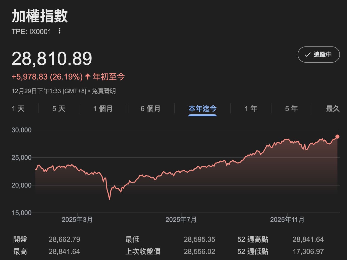 【紀路臺灣】2025 年 12 月 29 日,不畏中共圍臺軍演,台積電今天登 1530 元新天價,率領臺股攻高,三大法人合計買超 148.02 億元,臺股盤中最高衝上 28841.64 點創歷史新高,終場上漲 254.87 點,收在 28810.89 點同創收盤歷史新高,成交值 4390.98 億元。臺股自美國總統川普今年 4 月「解放日」以來,一度在 4 月 9 日跌至 17391.76 點,至今已上漲 11419.13 點、漲幅 65.66%。