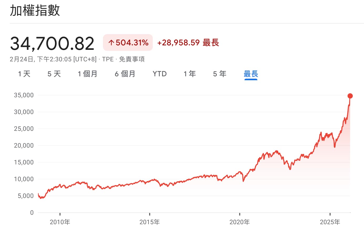 【紀路臺灣】2026 年 2 月 24 日,臺股今天開高走高,盤中一度漲超過千點,終場大漲 927.56 點,寫史上第 2 大漲點,收在 34700.82 點,盤中與收盤指數雙創歷史新高,三大法人合計買超 836.85 億元,成交值 8383.71 億元,臺股上市公司總市值達 113 兆 992 億元再度刷新紀錄;臺股從農曆蛇年封關前到馬年開紅盤,集中市場指數已連續 4 個交易日打破歷史新高紀錄;自美國總統川普 2025 年 4 月「解放日」以來,臺股一度在 4 月 9 日跌至 17391.76 點,至今已上漲 17309.06 點、漲幅 99.5%。