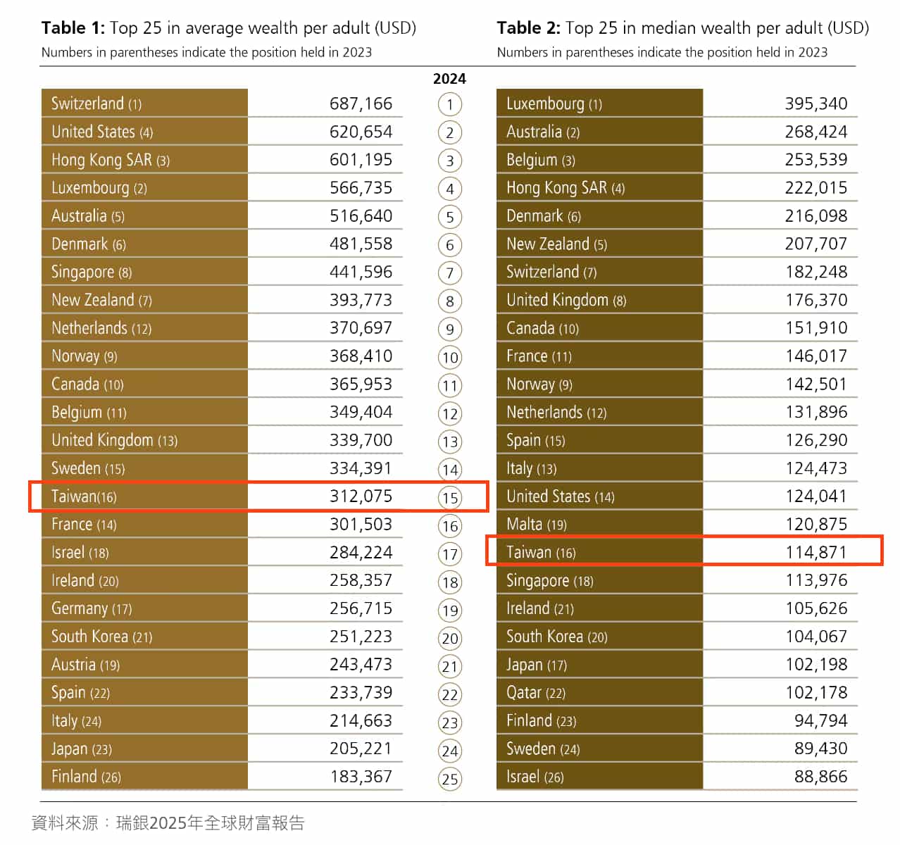 【紀路臺灣】2025 年 6 月 18 日,瑞士銀行(UBS)公佈 2025 全球財富報告(Global Wealth Report 2025),瑞士以成人人均資產 68.7 萬美元蟬聯第 1,臺灣成人人均資產 31.2 萬美元排名全球第 15,資產中位數 11.5 萬美元排名全球第 17,百萬美元富豪近 76 萬人排名全球第 15。臺灣成人平均財富過去 5 年增加 35%,成長幅度位居前段班,吉尼係數(Gini index)0.60,排名第 20。